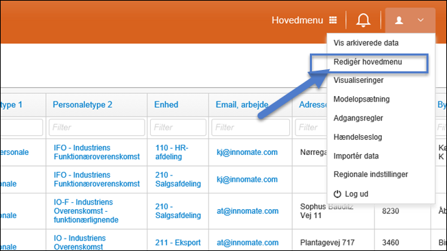 Hovedmenuen redigeres fra din personlige menu i øverste højre hjørne: Redigér hovedmenu.