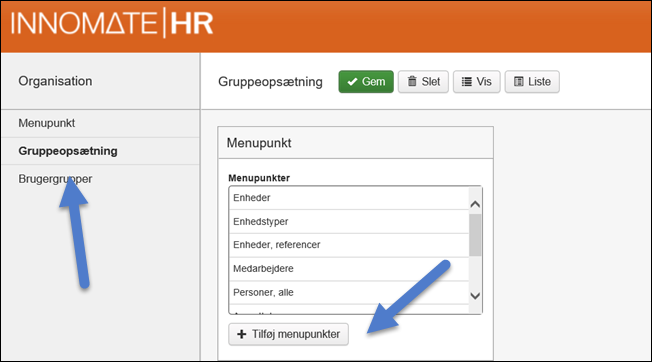Listen over menupunkter filtrerer du efter type=Gruppe.