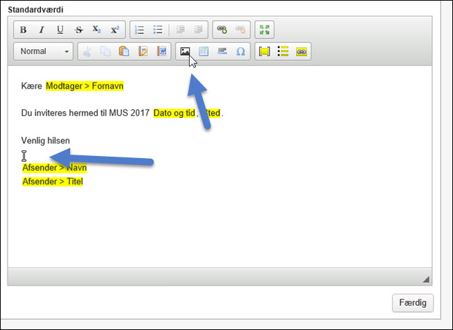 I det her tilfælde, ønsker jeg at indsætte en billedfil som logo på min signatur. Stil din cursor på det sted i teksten, hvor du vil have placeret billedet og klik derefter på ikonet for et billede på nederste værktøjslinje.
