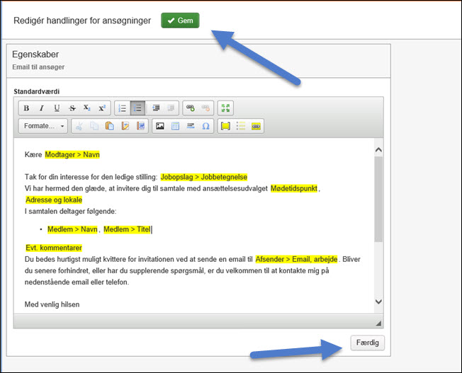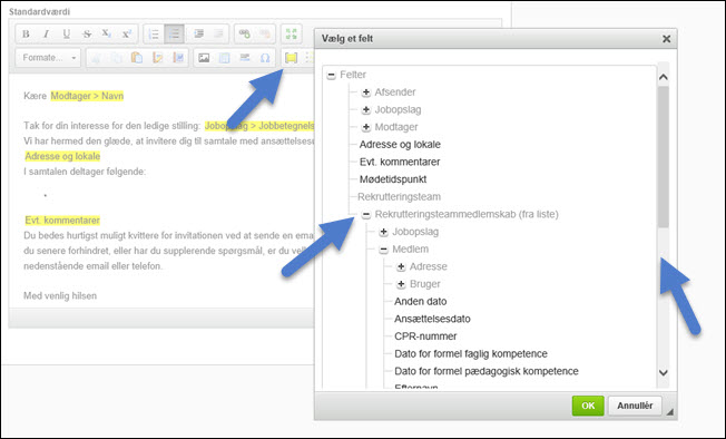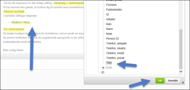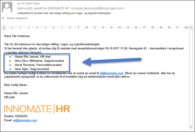 Her er et eksempel, hvor der i en HTML-skabelon til en email, der sendes som indbydelse til en ansættelsessamtale, er indsat en punkt-liste med navne og titler på medlemmerne af et rekrutteringsteam.