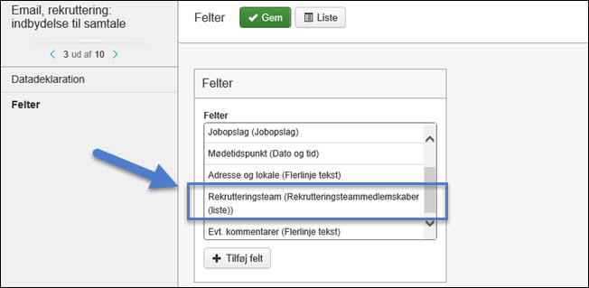 Der indsættes nu et indrykket punkt og ved at klikke på ikonet for indsættelse af fletfelt, bliver det nu muligt at vælge fra listen over 'rekrutteringsteamsmedlemskab (fra liste)'. Jeg folder listen ud og derefter underpunktet 'Medlem', scroller ned og finder 'Navn', markerer dette og klikker OK.
