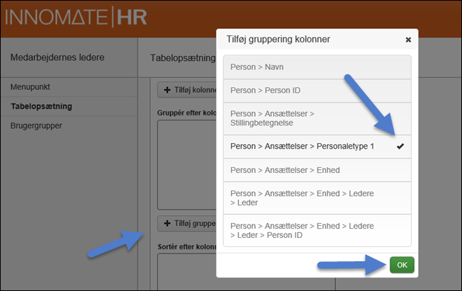 Klik på + Tilføj gruppering af kolonner. Det er ikke altid relevant af vælge gruppering, men i vores tilfælde vi vi godt have resultatet af listen grupperet efter Personaletype 1, hvilket vi derfor vælger.
