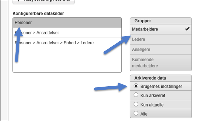 Næste linje i Konfigurerbare datakilder viser i vores tilfælde valgmuligheder for Ansættelser. Her er valg af relationsdata interessant. Vi vil ikke have vist historiske data og ej heller fremtidige data om medarbejderes ansættelsesforhold. Derfor vælger vi at markere i feltet Nuværende.