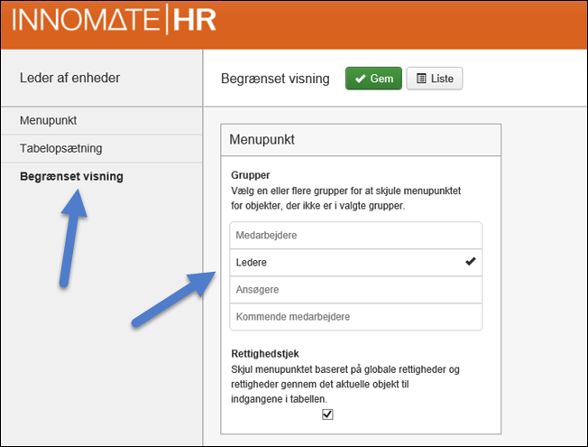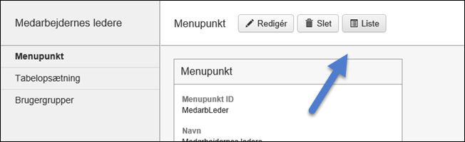For hovedmenupunkter, skal der angives hvilke brugergruppe(r), der skal kunne se den pågældende liste i menuen og have adgang til den.