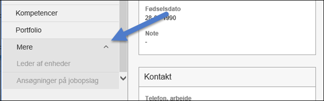 I det viste eksempel, vil punktet Leder af enheder kun blive vist i personens detailmenu, hvis personen er leder. I modsat fald gemmes punktet under nederste punkt Mere, der dog kan foldes ud.