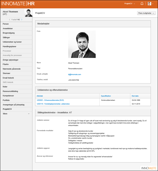 F.eks., kan der i person-detailmenuen designes en side, der kan bruges som CV, når virksomheden byder ind på opgaver og har brug for at vedhæfte CV-er på de medarbejdere, der indgår i opgaveløsningen. Siden kan opbygges med præcis de data, man ønsker skal indgå. Nedenfor ses et eksempel på en sådan side.