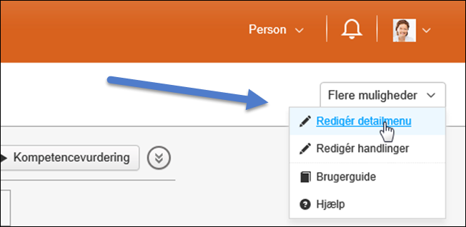 Vælg den ønskede objekttype, menuen Flere muligheder og klik på Redigér detailmenu.