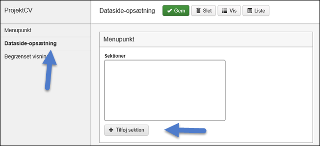 Herefter vises detailmenuen for opsætning af menupunktet ProjektCV.