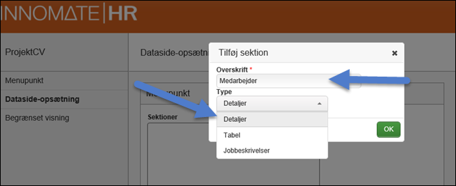 Skriv først en overskrift (her. Medarbejder) og vælg herefter type. Der kan vælges mellem typerne: