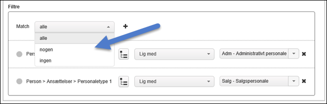 Der er to andre muligheder for Match: nogen eller ingen. Anvender jeg nogen, vil resultatet vise alle medarbejdere, der enten tilhøre den ene eller den anden personaletype 1.