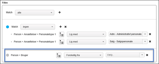 Vil jeg derimod gerne have et resultat, hvor personaletype 1 er hverken adm. eller salgspersonale, men medarbejderen samtidig er bruger på systemet, må jeg anvende et kombineret filter.