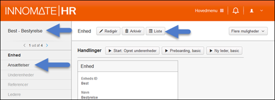 - Vælg de personer, der skal være ansat i enheden. (Undgå at sætte leder af enheden til at være leder for sig selv. En leder er typisk ansat højere oppe i organisationen end den enhed han/hun er leder for).